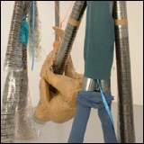 " Dialog between giants " is a project from 2003 and was to be seen in the " studios 93 " in Hengelo - the Netherlands. Five meter high giants play with a women's figure! The material is printed plastic foil, orange rope and a women's figure out of tape. |